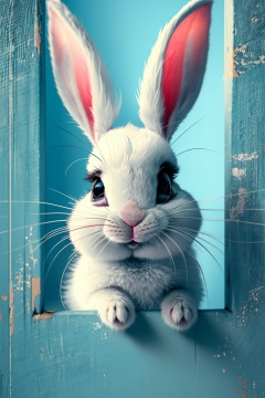 masterpiece,best quality,solo, peeking out, looking at viewer, no humans, animal, blue background, rabbit, animal focus, white rabbit