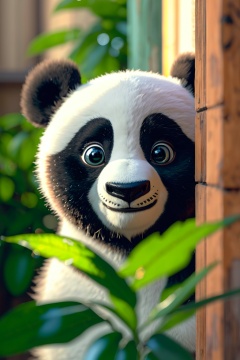 masterpiece,best quality,solo, peeking out, looking at viewer, smile, blurry, no humans, animal, animal focus, leaf, panda