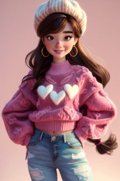 masterpiece,best quality,1girl, solo, long hair, looking at viewer, smile, simple background, brown hair, long sleeves, hat, brown eyes, jewelry, very long hair, heart, cowboy shot, earrings, pants, sweater, white headwear, pink background, freckles, hands on hips, jeans, hoop earrings, white pants, pink sweater, cable knit