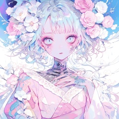 a woman with tattoos and a flower in her hair, wearing a pink outfit and holding a flower in her hand, Artgerm, blue and pink color scheme, cyberpunk art, synchromism,