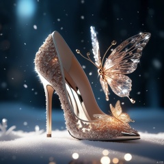 (8k, RAW photo, best quality, masterpiece:1.2),(super realistic, photo-realistic:1.3),ultra-detailed,extremely detailed cg 8k wallpaper,1girl,sparkle,blurry,crystal,(gem:1.3),glint,wings,still life,light particles,full body,(foot:1.3),(high_heels:1.5),(sparkling crystal butterfly:1.3),(high_heels:1.3),depth of field,butterfly wings,crystal theme,beads,(Snow:1.5),blurry background,,