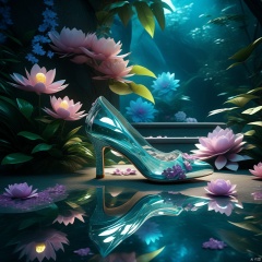 (8k, RAW photos, best quality, masterpiece: 1.2), ggx hd, no humans, still life photography, petals, water reflection, flowers, glitter, purple theme, crystal glass shoes, blurry, reflective flooring, Chinese 3D landscape painting background, (complex carving background), Chinese Song Dynasty landscape painting, blue theme, surrealist fantasy style, organic fluid, ray tracing, colored flowers, flower foreground occlusion, natural light, Jungle, c4d, OC rendering,