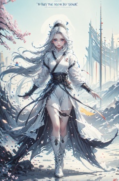 (1girl:1.7),((solo)),((a beautiful girl)),(((full body shot))),((standding on liquid)),(facing away),(+perfect hand+:1.21),(((white coat))),((beautiful white dress+white knee boots)),((Belts)),((white hat)),(white scarf),(leg loops),(((long white_hair))),