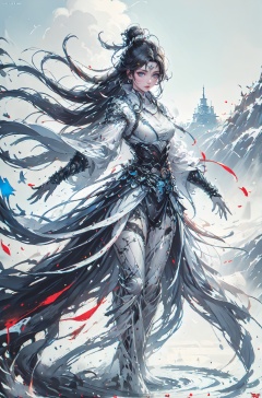 (1girl:1.7),((solo)),((a beautiful girl)),(((full body shot))),((standding on liquid)),(facing away),(+perfect hand+:1.21),(((white coat))),((beautiful white dress+white knee boots)),((Belts)),((white hat)),(white scarf),(leg loops),(((long white_hair))),