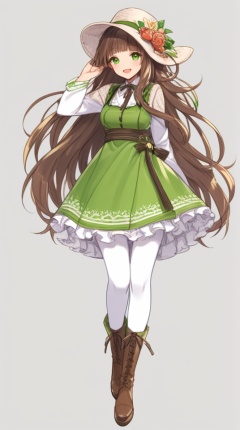 (best quality), ((masterpiece)), (highres), illustration, original, extremely detailed,   <lora:恩佩西斯的闪光:0.7>1girl, solo, long hair, green eyes, dress, green dress, smile, hat, open mouth, boots, brown hair, brown footwear, looking at viewer, full body, very long hair, hat flower, :d, flower, sketch, arms behind back, long sleeves, white pantyhose
