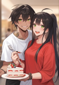 (best quality), ((masterpiece)), (highres), illustration, original, extremely detailed,   <lora:恩佩西斯的闪光:0.7>black hair, 1girl, food, 1boy, shirt, cake, smile, fork, green eyes, white shirt, long hair, multicolored hair, black nails, tattoo, blush, bangs, yellow eyes, holding, upper teeth only, open mouth, blurry background, blurry, closed mouth, holding fork, red shirt, teeth, holding hands, ahoge, dark skin, hair between eyes, plate