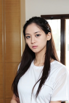 1girl, solo, long hair, looking at viewer, shirt, black hair, closed mouth, white shirt, upper body, indoors, black eyes, lips, window, watermark, realistic, nose