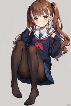 1girl,solo,loli,pantyhose,school_uniform,no_shoes,skirt,sitting,smile,black_pantyhose,white_background,long_hair,black_hair,simple_background,blue_skirt,looking_at_viewer,serafuku,feet,cardigan,sailor_collar,neckerchief,brown_eyes,full_body,pleated_skirt,blue_sailor_collar,long_sleeves,closed_mouth,bangs,sleeves_past_wrists,soles,green_neckerchief,black_eyes