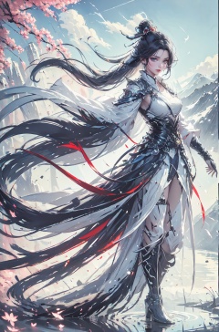 (1girl:1.7),((solo)),((a beautiful girl)),(((full body shot))),((standding on liquid)),(facing away),(+perfect hand+:1.21),(((white coat))),((beautiful white dress+white knee boots)),((Belts)),((white hat)),(white scarf),(leg loops),(((long white_hair))),