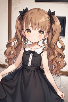 1girl, solo, long hair, looking at viewer, blush, bangs, blonde hair, hair ornament, red eyes, dress, bow, bare shoulders, very long hair, closed mouth, collarbone, hair bow, sleeveless, indoors, virtual youtuber, off shoulder, nail polish, black dress, two side up, parted bangs, bare arms, black bow, sleeveless dress, strap slip,loli,