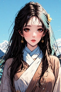 1girl,solo,long hair,looking at viewer,brown hair,black hair,hair ornament,brown eyes,jewelry,upper body,flower,earrings,outdoors,sky,scarf,blurry background,facial mark,chinese clothes,mountain,forehead mark, jijianchahua