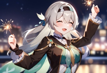 a girl named liuying,liuying,1girl,solo,outdoors,blurry background,upper body,holding,open mouth,black jacket,white shirt,high quality,sparkler,spread arms,city lights,night sky,:d,masterpiece,best quality,(very aesthetic:1.2),absurdres,<lora:流萤a31:1>,grey hair,<lora:Fixhands_anime_bdsqlsz_V1:0>,watercolor \(medium\),