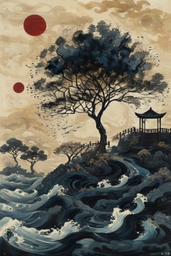 Stranger tales, chinese ink painting, abstract, gongbi, surrealism, no humans, dark background, dark theme, tree, east asian architecture, wave<lora:EMS-307144-EMS:0.800000>