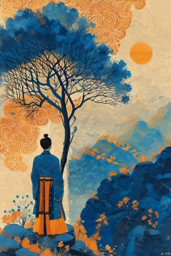 Zen painting illustration,man overlooking cliff, flowing patterns, textured, blue and orange palette, traditional attire, serene, stylized natural elements, minimalist figure, digital art, vintage aesthetic, 1girl, HHL<lora:EMS-307144-EMS:0.800000>