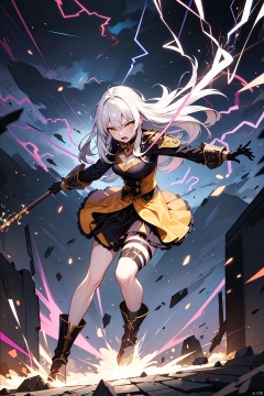 1girl, solo, (motion lines:1.1), bloom, cinematic lighting, full body, white hair, yellow eyes, intricate skirt, (fighting:1.2), angry, (thunder:1.3), (flying sparks), dynamic angle
