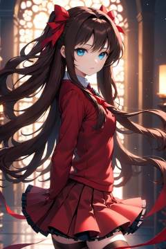 masterpiece,best quality,cinematic,dynamic lighting,blurry background,Rin Tohsaka,1gir,tohsaka rin,solo,long hair,brown hair,black thighhighs,blue eyes,pleated skirt,two side up,red hair ribbon,red sweater,parted bangs,jewelry,(full body:1.1),