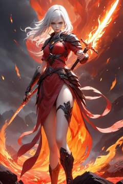 best quality,masterpiece,realistic,Highly detailed,ultra-fine painting,extreme detail description,Vivid Colors,huge_filesize,wallpaper,official art,extremely detailed CG unity 8k wallpaper,absurdres,1girl,solo,red clothes,white hair,red long knife,red background,magma,flame,battlefield,dazzling cool,Turning,standing,