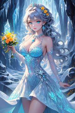 (masterpiece, top quality, best quality, official art, beautiful and aesthetic:1.2), 1girl, 20yo (sexy detailed and beautiful face:1.2), large breasts, wavy hair, updo, bangs, ice hair bow, beautiful eyes, ((ice wedding dress)), (glowing colorful fluorescent dress effect:1.5), evil smiling, ornate jewelry and jewelry, necklace, earrings, bracelet, holding flowers, frozen darkness cave, (upper thighs shot:1.2),