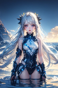 ((masterpiece)), ((best quality)), ((illustration)), extremely detailed,style girl, long shot, small breast,light grey very_long_hair, scifi hair ornaments, beautiful detailed deep eyes, beautiful detailed sky, beautifuldetailed water, cinematic lighting, (/qingning/), (\MBTI\), babata