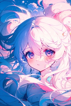 1 girl, chibi proportions, exaggerated facial features, pastel candyland environment, floating clouds shaped like sweets, giant ice cream mountains, cotton candy trees, hypercolor palette, whimsical fonts, cartoonish shadows.