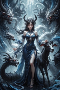(official art,unity 8k wallpaper,ultra detailed,High quality,best quality),(zentangle, mandala, tangle, entangle:0.6),(blue black),flat color,limited palette,low contrast,(1girl:1.5),solo,serafuku,long straight black hair,lycoris flower,(goat skull:1),(horror),(gloomy),(blue pigment:1.33),(hollow eyes:1),(expressionless eyes:1.3),cowboy shot,full body, drakan_longdress_dragon crown_headdress