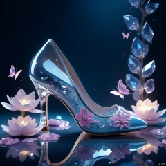 (8k, RAW photos, best quality, masterpiece: 1.2), ggx hd, no humans, still life photography, petals, water reflection, flowers, glitter, purple theme, crystal glass shoes, blurry, reflective flooring, Chinese 3D landscape painting background, (complex carving background), Chinese Song Dynasty landscape painting, blue theme, surrealist fantasy style,Lightning,light,