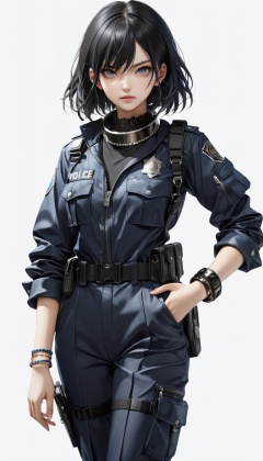 1 young cool girl, solo,look at the camera,wear police suit,extremely detailed CG unity 8k wallpaper,illustration,lens 135mm,masterpiece,(bracelet:1.3),(metal collar:1.3),white background,masterpiece,bestquality,masterpiece,best eyes,Standing, black quality,black_hair, masterpiece,best quality,dark persona,masterpiece,best quality,