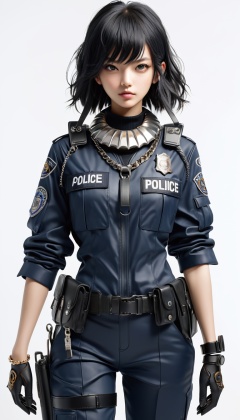 1 young cool girl, solo,look at the camera,wear police suit,extremely detailed CG unity 8k wallpaper,illustration,lens 135mm,masterpiece,(bracelet:1.3),(metal collar:1.3),white background,masterpiece,bestquality,masterpiece,best eyes,Standing, black quality,black_hair, masterpiece,best quality,dark persona,masterpiece,best quality,