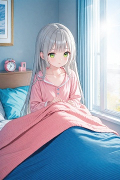 (masterpiece),(best quality),illustration,ultra detailed,hdr,Depth of field,(colorful),loli,1girl,clock,solo,alarm clock,under covers,green eyes,bed,long hair,pillow,indoors,sunlight,curtains,pajamas,grey hair,blanket,window,collarbone,bangs,