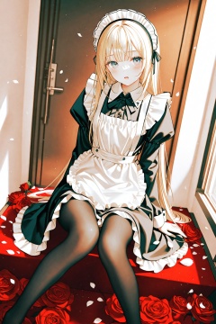 masterpiece,best quality,illustration,ultra detailed,hdr,Depth of field,(colorful),[Artist chen bin],[iumu],Artist roha,1girl,solo,long hair,rose,maid,blonde hair,maid headdress,flower,looking at viewer,red flower,apron,red rose,pantyhose,maid apron,dress,blush,petals,long sleeves,black pantyhose,sitting,frills,parted lips,blue eyes,black dress,white apron,rose petals,indoors,open mouth,
