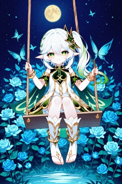 masterpiece,best quality,illustration,ultra detailed,hdr,Depth of field,(colorful),[Artist chen bin],Artist Sheya,1girl,nahida (genshin impact),green eyes,solo,pointy ears,side ponytail,dress,white hair,white dress,hair ornament,smile,symbol-shaped pupils,long hair,sitting,swing,looking at viewer,flower,multicolored hair,bracelet,butterfly,green hair,gradient hair,bug,night,signature,hair between eyes,jewelry,rose,leaf hair ornament,detached sleeves,closed mouth,toeless legwear,cross-shaped pupils,full body,cape,braid,outdoors,bloomers,moon,short sleeves,night sky,sleeveless dress,blue flower,sky,sleeveless,stirrup legwear,