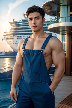 masterpiece, divine titan, 1 Man, Look at me, On the sea surface, overalls, Cruise ship, Sunrise, textured skin, super detail, best quality, 8k, ccurate,