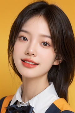 a girl laughing, with an orange background, portrait,,school_uniform, 1girl
