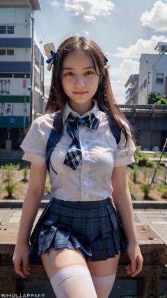 (Raw photography:1.5),(top-quality:1.5),17 years old,One girl,(Smiling),((Japan schoolgirl uniform、White short-sleeved shirt、a bow tie、Navy Blue Plaid Pleated Skirt、Dark blue high socks:1.2)),((hime-cut)),looking at the viewers、Facing the audience,realism, rinrada,outdoors