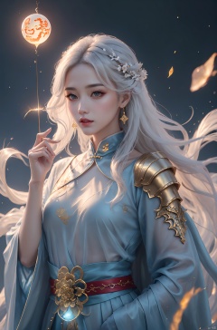 a woman with white hair holding a glowing ball in her hands, white haired deity, by Yang J, heise jinyao, inspired by Zhang Han, xianxia fantasy, flowing gold robes, inspired by Guan Daosheng, human and dragon fusion, cai xukun, inspired by Zhao Yuan, with long white hair, fantasy art style,,Ink scattering_Chinese style, smwuxia Chinese text blood weapon:sw, lotus leaf, (\shen ming shao nv\), gold armor, a boy_gmlwman, wunv, (/qingning/), (\MBTI\)
