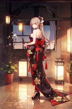 1girl, jean bart \(azur lane\), sword, kimono, long hair, solo, high ponytail, weapon, official alternate costume, japanese clothes, katana, standing, looking at viewer, holding, breasts, sash, high heels, hand fan, folding fan, hair ornament, wooden floor, red sash, petals, alternate costume, medium breasts, sheath, red flower, print kimono, holding fan, black kimono, tassel, obi, full body, floral print, earrings, flower, ponytail, bare shoulders, jewelry, sheathed, red eyes, bow, strapless, backless outfit, black background, indoors, sideways glance, brown hair, dress, window, architecture, carpet, lantern, hair bow, very long hair, closed mouth, east asian architecture, sidelocks, gold choker, strapless dress, black footwear, off shoulder, sideboob, faux figurine, light brown hair