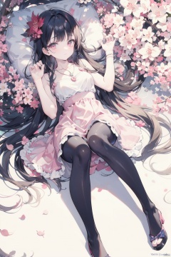 A peerless beauty, under a blooming cherry blossom tree surrounded by pink fallen leaves, wearing a pink dress, sunlight shining through the colorful leaves, black pantyhose, necklace, best quality, 8k