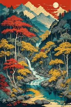 masterpiece,best quality, line art,line style,lake,water fall,trees,mountain),(((masterpiece,best quality))),A monk in yellow clothes is by the water's edge,1boy,night,red theme,