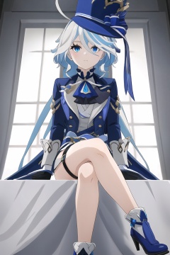 (masterpiece, best quality:1.2),Furina_Pneuma,1girl,solo,blue hat,high heels,heterochromia,thigh strap,jacket,long sleeves,white shorts,long hair,neck ruff,leg garter,mismatched gloves,crossed legs,sitting on object,indoors,<lora:Furina-000006:1>,