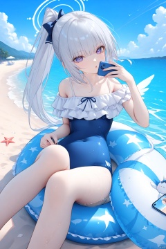 1girl, solo, long hair, looking at viewer, bangs, bow, holding, bare shoulders, sitting, purple eyes, swimsuit, ponytail, white hair, hair bow, grey hair, outdoors, frills, sky, cloud, water, wet, one-piece swimsuit, bare legs, ocean, halo, beach, phone, school swimsuit, cellphone, smartphone, holding phone, innertube, blue one-piece swimsuit,miyakoBA,miyakoSwimsuit