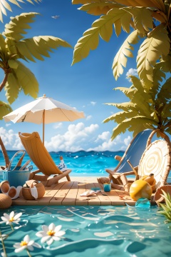 OC rendering,C4D,3D,product photography,still life,flower,outdoors,food,day,water,tree,no humans,umbrella,beach,sandals,sand,palm tree,basket,bucket,coconut,