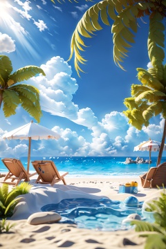 OC rendering,C4D,3D,product photography,still life,outdoors,sky,day,cloud,water,tree,blue sky,no humans,ocean,umbrella,beach,sand,palm tree,beach umbrella,
