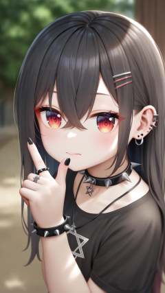 surreal,amazing quality,masterpiece,best quality,awesome,inspiring,cinematic composition,soft shadows,Film grain,shallow depth of field,highly detailed,high budget,cinemascope,epic,color graded cinematic,atmospheric lighting,imperfections,natural,shallow dof,1girl,jewelry,solo,red eyes,black hair,long hair,shirt,black shirt,spikes,black nails,earrings,looking at viewer,hair ornament,short sleeves,blurry background,upper body,ring,closed mouth,necklace,tattoo,ear piercing,hair between eyes,bracelet,blurry,crossed bangs,nail polish,star of david,hand up,piercing,cross,blush,choker,hexagram,collar,arm tattoo,punk,outdoors,index finger raised,spiked bracelet,hairclip,t-shirt,multiple rings,spiked collar,black choker,