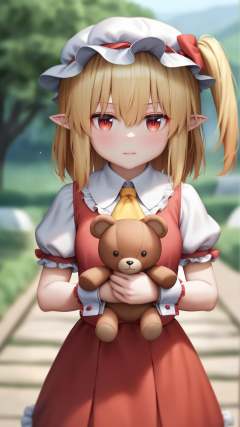 surreal,amazing quality,masterpiece,best quality,awesome,inspiring,cinematic composition,soft shadows,Film grain,shallow depth of field,highly detailed,high budget,cinemascope,epic,color graded cinematic,atmospheric lighting,imperfections,natural,shallow dof,1girl,flandre scarlet,touhou,hat,mob cap,solo,blonde hair,stuffed toy,red vest,wings,stuffed animal,teddy bear,red eyes,crystal,vest,white headwear,outdoor,short sleeves,one side up,holding,puffy sleeves,skirt,shirt,pointy ears,red skirt,looking at viewer,puffy short sleeves,ascot,yellow ascot,wrist cuffs,white shirt,holding stuffed toy,bow,frills,red bow,collared shirt,ribbon,frilled shirt collar,red ribbon,medium hair masterpiece,best quality,very aesthetic,absurdres,