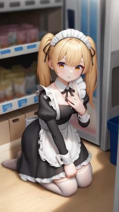 surreal,amazing quality,masterpiece,best quality,awesome,inspiring,cinematic composition,soft shadows,Film grain,shallow depth of field,highly detailed,high budget,cinemascope,epic,color graded cinematic,atmospheric lighting,imperfections,natural,shallow dof,1girl,solo,looking at viewer,kurumi_ebisuzawa,twin tails,hair ribbon,maid,maid headdress,maid apron,black dress,frills,thighhighs,bow,cleavage,neck ribbon,juliet sleeves,thighhighs,indoors,convenience store,shop,kneeling,hand on own chest,parted lips,