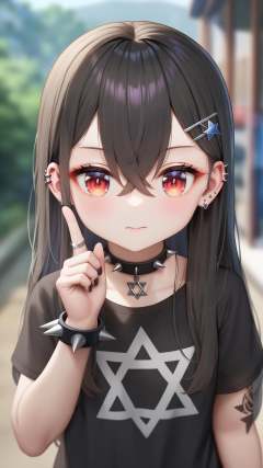 surreal,amazing quality,masterpiece,best quality,awesome,inspiring,cinematic composition,soft shadows,Film grain,shallow depth of field,highly detailed,high budget,cinemascope,epic,color graded cinematic,atmospheric lighting,imperfections,natural,shallow dof,1girl,jewelry,solo,red eyes,black hair,long hair,shirt,black shirt,spikes,black nails,earrings,looking at viewer,hair ornament,short sleeves,blurry background,upper body,ring,closed mouth,necklace,tattoo,ear piercing,hair between eyes,bracelet,blurry,crossed bangs,nail polish,star of david,hand up,piercing,cross,blush,choker,hexagram,collar,arm tattoo,punk,outdoors,index finger raised,spiked bracelet,hairclip,t-shirt,multiple rings,spiked collar,black choker,full body,