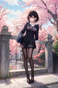 1girl, solo, skirt, pantyhose, shirt, black hair, rain, looking at viewer, black skirt, red eyes, white shirt, pleated skirt, long sleeves, bangs, black pantyhose, full body, school uniform, breasts, outdoors, tree, smile, cherry blossoms, necktie, collared shirt, no shoes, leaning forward, standing, wet clothes, see-through, short hair, wet, legs, pink necktie, medium breasts