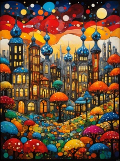 autumntime cityscape painting by Yayoi Kusama, in the style of colorful drawings, joe madureira, hans baldung, romantic graffiti, stained glass, multi-layered color fields