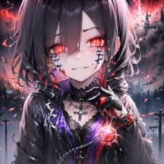 暗夜禁咒冥王之主(loli,bishoujo,kawaii,evil),evil smile,red eyes,black gloves,face close-up,girl,Delicate face (forest),red eyes,night,(kawaii),Cross bangs, Exquisite face and eyes,cute face,short (moon,evil smile,black hairs),(red face painting,kawaii)(bloom,red lightning), (dark),evil eyes,red eyes(beautiful detailed eyes), (green and glowing eyes,castle,black jacket)),bishoujo, Black hair, bangs,dark, purple eyes, single person, broken feeling, kawaii, cool feeling, castle, magic circle, kawaii,(upper body), hair strand, wet, short hair, (kawaii, medium hair,skull),((evil smile,crazy,dark_persona, crazy, medium hair,dark_persona, black hair,upper body)),cross band,wet hair, castle, hairpin, chains, ribbon_choker, collar, black colorful particles and light effects, night, kawaii, blackgloves(extremely detailed CG unity 8k wallpaper),(((extremely detailed face and eyes,extremely beautiful and delicate face and eyes,wallpaper, extremely detailed face and eyes,fluttered detailed surroundings,extremely detailed CG unity 8k wallpaper,amazing,highly detailed,)), (best illustration),(best shadow), ((an extremely delicate and beautiful)),(oil painting \(medium\):1.5),evil expressionless,purple magic,green magic((medium hair, black hair, streaked hair, short hair with long locks, bangs, long bangs,hair over eyes, hair behind ear,looking at viewer,((expressionless)),short hair with long locks,dyed bangs,((castle)), weapons,((magic_circle)), purple ,black gloves,pupils,green, beautiful detailed eyes, red eyes, glowing eyes,coat, ((dagger,red eyes)),black gloves,grabbing, solo,,upper body,kawaii,((black jacket,delicate face))(blood on face,red face painting)((kawaii,bishoujo,black hairs)),wristwatch,chains,city,((coat)),evil eyes,bishoujo,(purple,jacket,) ,fire ,skull,short hair with long locks, dyed bangs,((Red magic special effects, red lightning, red magic light effects,face close-up,kawaii,Red light,red lightning,kawaii,bishoujo)),(opening jacket,upper body),black hairs<lora:EMS-309992-EMS:0.230000>, <lora:EMS-302518-EMS:0.600000>, <lora:EMS-314300-EMS:0.500000>