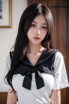 8k,RAW photo,best quality,masterpiece,realistic,1girl,large breasts,center frills,shirt,upper body,sailor_shirt,<lora:晓晓2:0.6>,